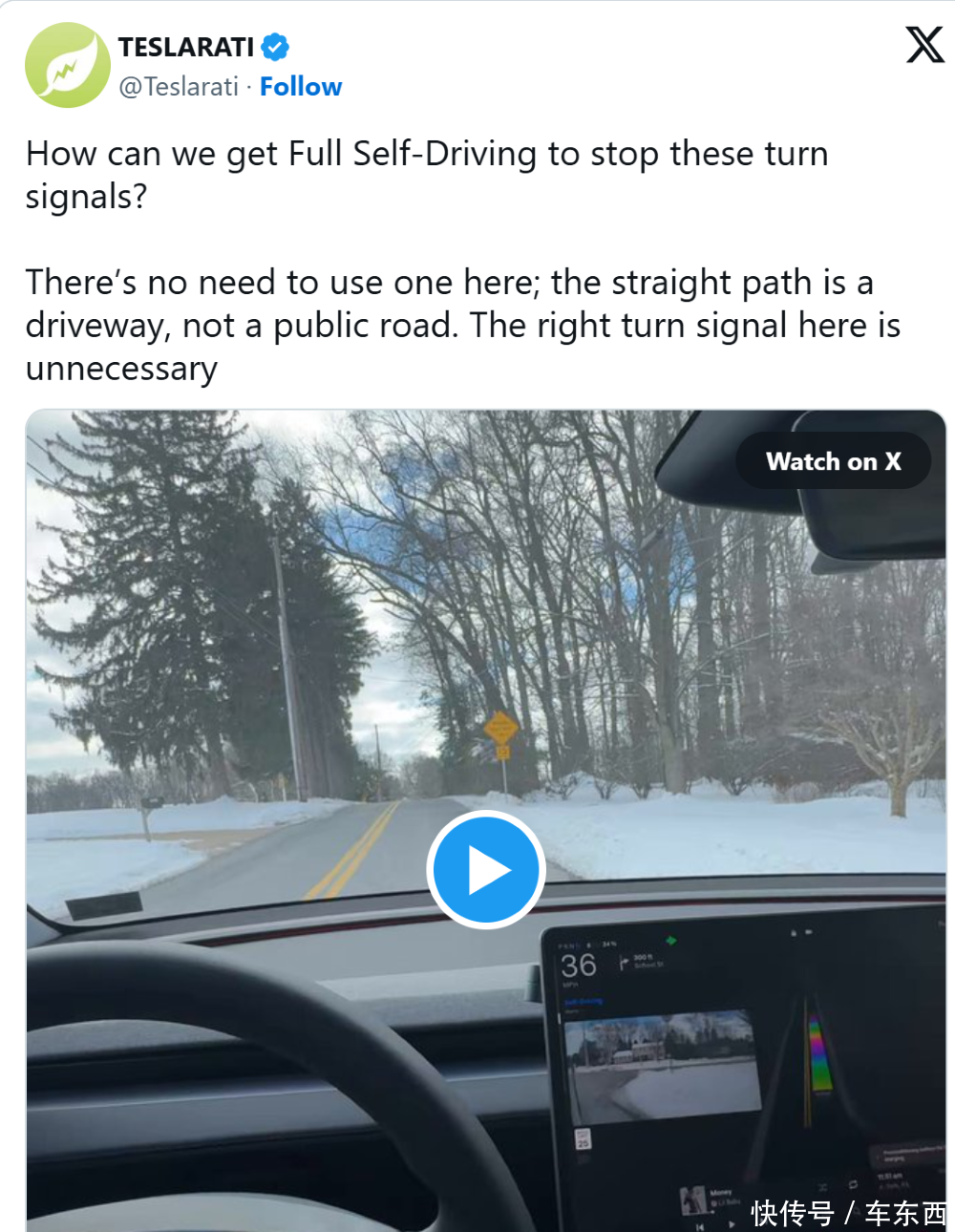 Teslarati发帖称FSD在路过私人车道时误打右转向灯
