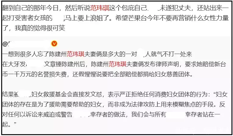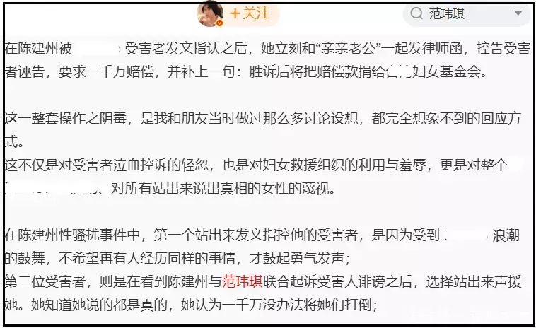 在抵制网友看来,抵制范玮琪并不是苛责女性,是因为她和陈建州是利益共同体,夫妻俩联手用官司对受害者施压,用金钱和权势去霸凌受害者,胁迫受害者闭嘴。
